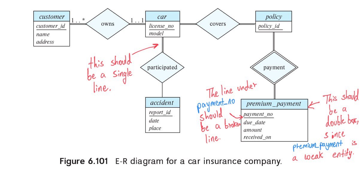 Note that the double-line connecting the entity set car to the relationship participated should be a single-line, since we could have cars that have not participated in any accident until now. That is, the participation of the entity car in the relationship participated is not total, thus it is partial.