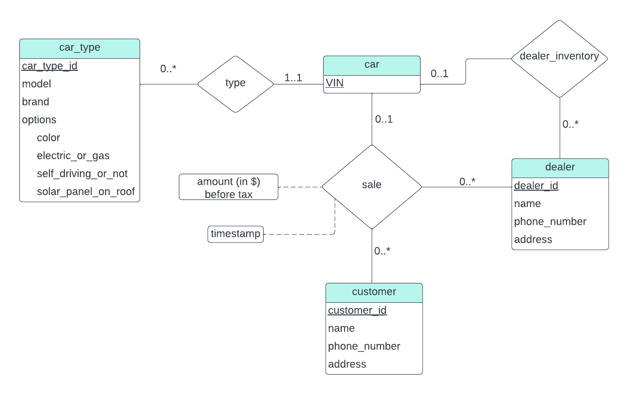 car_type(car_type_id, model, brand, color, electric_or_gas, self_driving_or_not,solar_panel_on_roof)car(VIN, car_type_id, dealer_id)