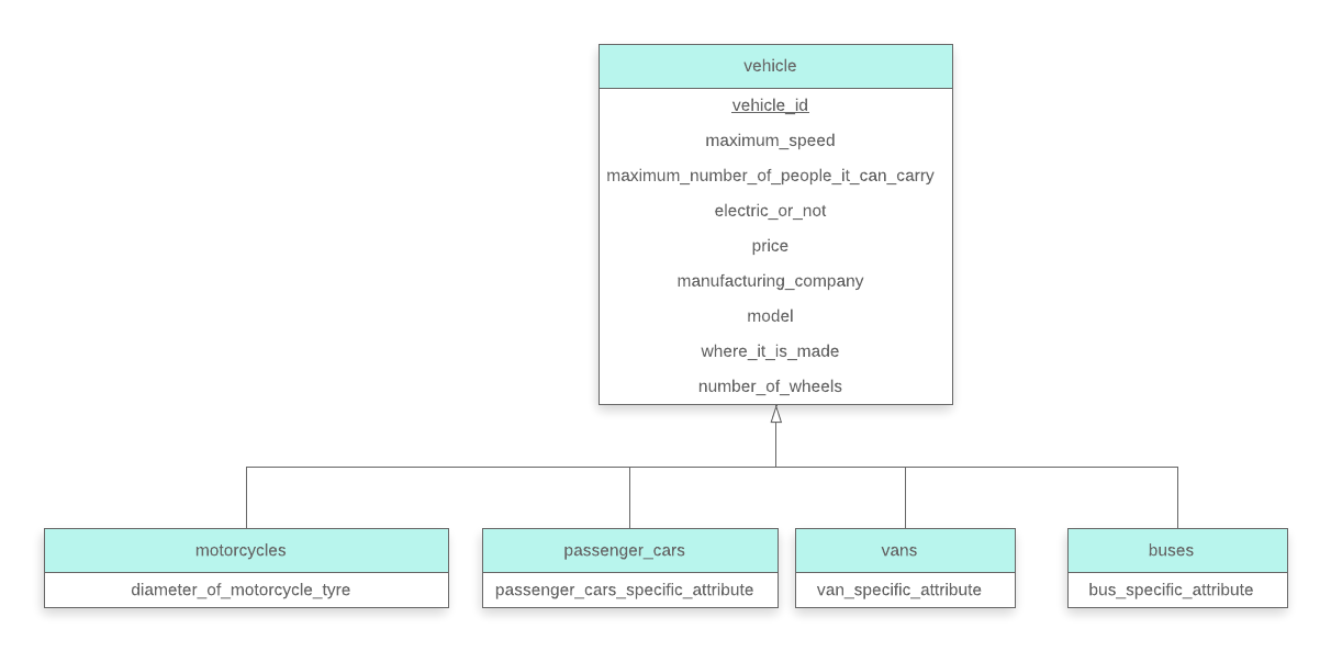 Design a generalization-specialization hierarchy for a motor vehicle sales company. The company sells motorcycles, passenger cars, vans, and buses. Justify your placement of attributes at each level of the hierarchy. Explain why they should not be placed at a higher or lower level.