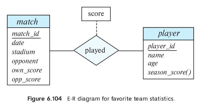 The diagram is shown in Figure 6.104. The derived attribute season_score is computed by summing the score values associated with the player entity set via the played relationship set.
