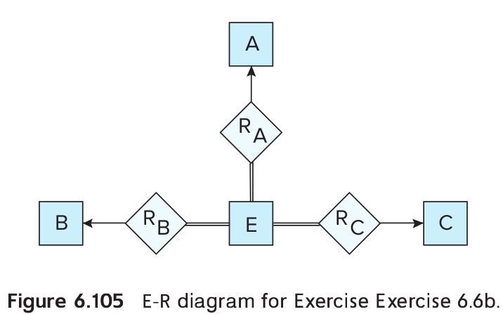 b. See Figure 6.105. The idea is to introduce total participation constraints between and the relationships , , so that every tuple in has a relationship with ,, and .
