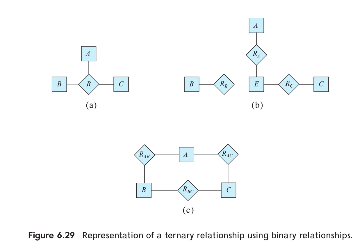 Consider the representation of the ternary relationship of Figure 6.29a using the binary relationships illustrated in Figure 6.29b (attributes not shown).