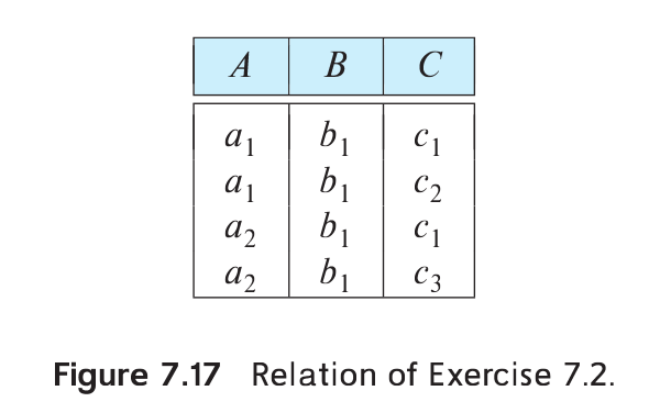 List all nontrivial functional dependencies satisfied by the relation of Figure 7.17.