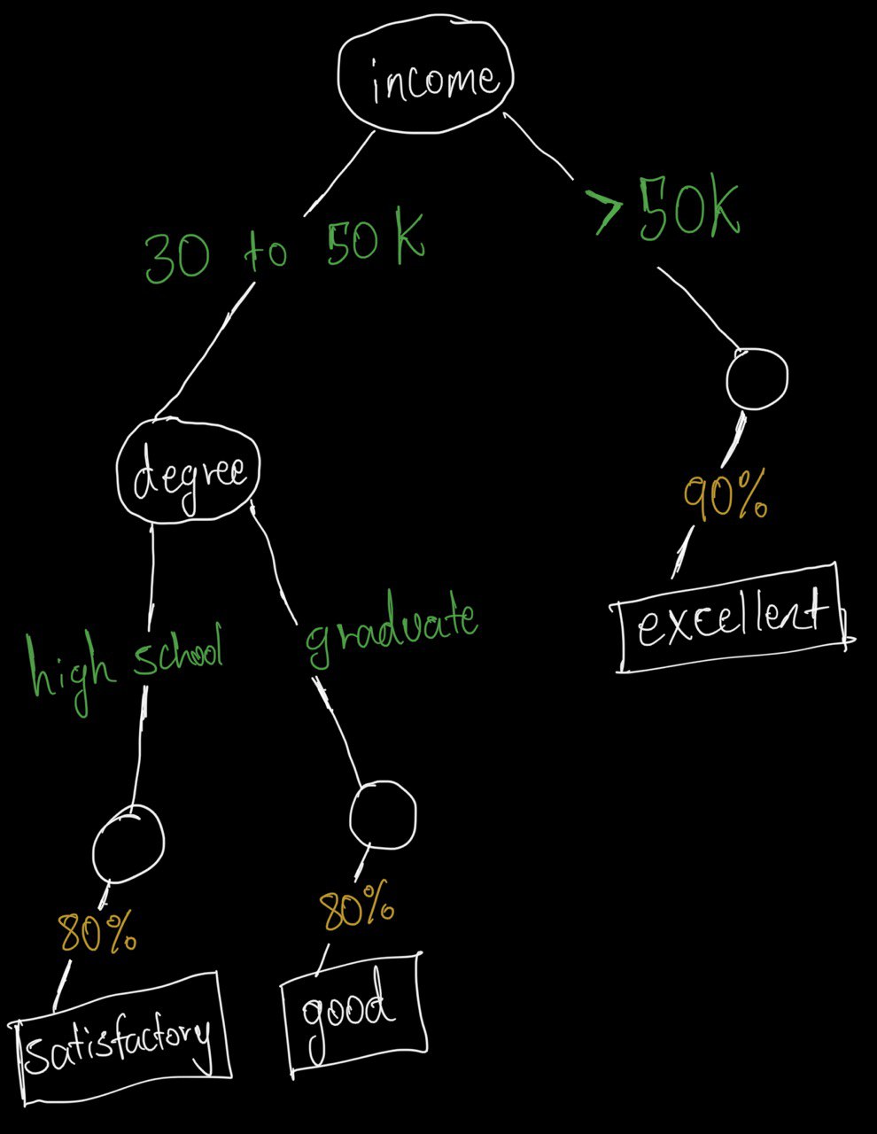 For example, a classification rule for credit ratings may have a condition that salary is between 50,000, and education level is graduate, with the credit rating class of good, and a confidence of 80%. A second rule may have a condition that salary is between 50,000, and education level is high-school, with the credit rating class of satisfactory, and a confidence of 80%. A third rule may have a condition that salary is above $50,001, with the credit rating class of excellent, and a confidence of 90%. Show a decision tree classifier corresponding to the above rules.