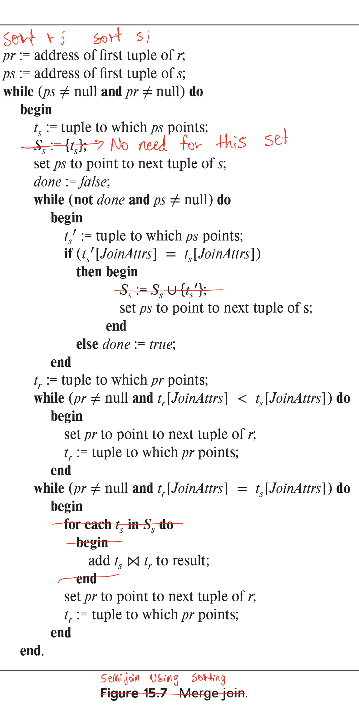 - Semijoin using sorting: Sort both and on the join attributes in . Perform a scan of both and similar to the Merge-Join Algorithm (read section 15.5.4.1) and add tuples of to the result whenever the join attributes of the current tuples of and match. The following modifies pseudocode of the Merge-Join Algorithm given in the book to work for Semijoin: