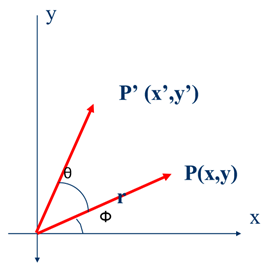 - Now, let’s rotate the point P by an angle counterclockwise around the origin to a new position P’ with coordinates .