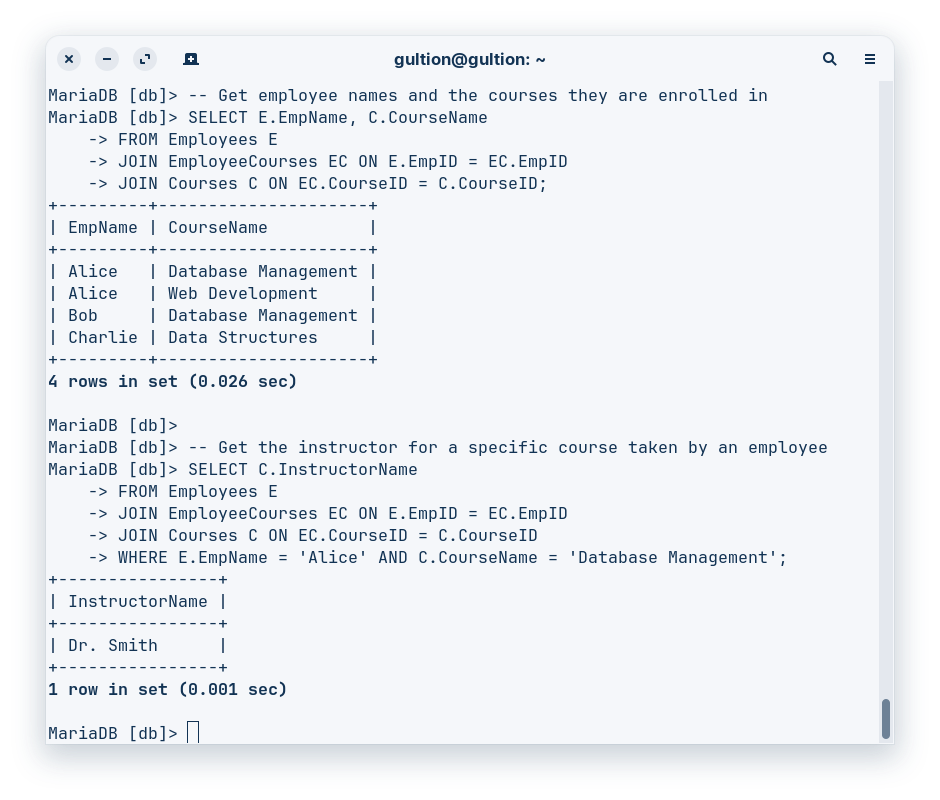 WHERE E.EmpName = 'Alice' AND C.CourseName = 'Database Management';